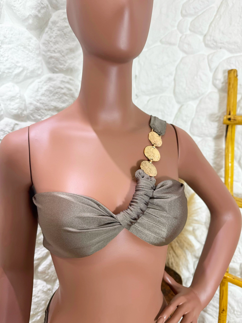 Novidade por aqui! O modelinho Arraial mistura a elegância do dourado com a versatilidade do top faixa, super tendência do verão. O modelo possui espuma removível, medalhas douradas em metal e banho cataforese, com amarração nas costas que proporcionam o melhor ajuste da peça ao busto. Já a calcinha coringa asa delta, combina versatilidade com conforto. Tendo suas laterais altas que modelam a silhueta além de sua costa semifio, que é o charme! ❤️